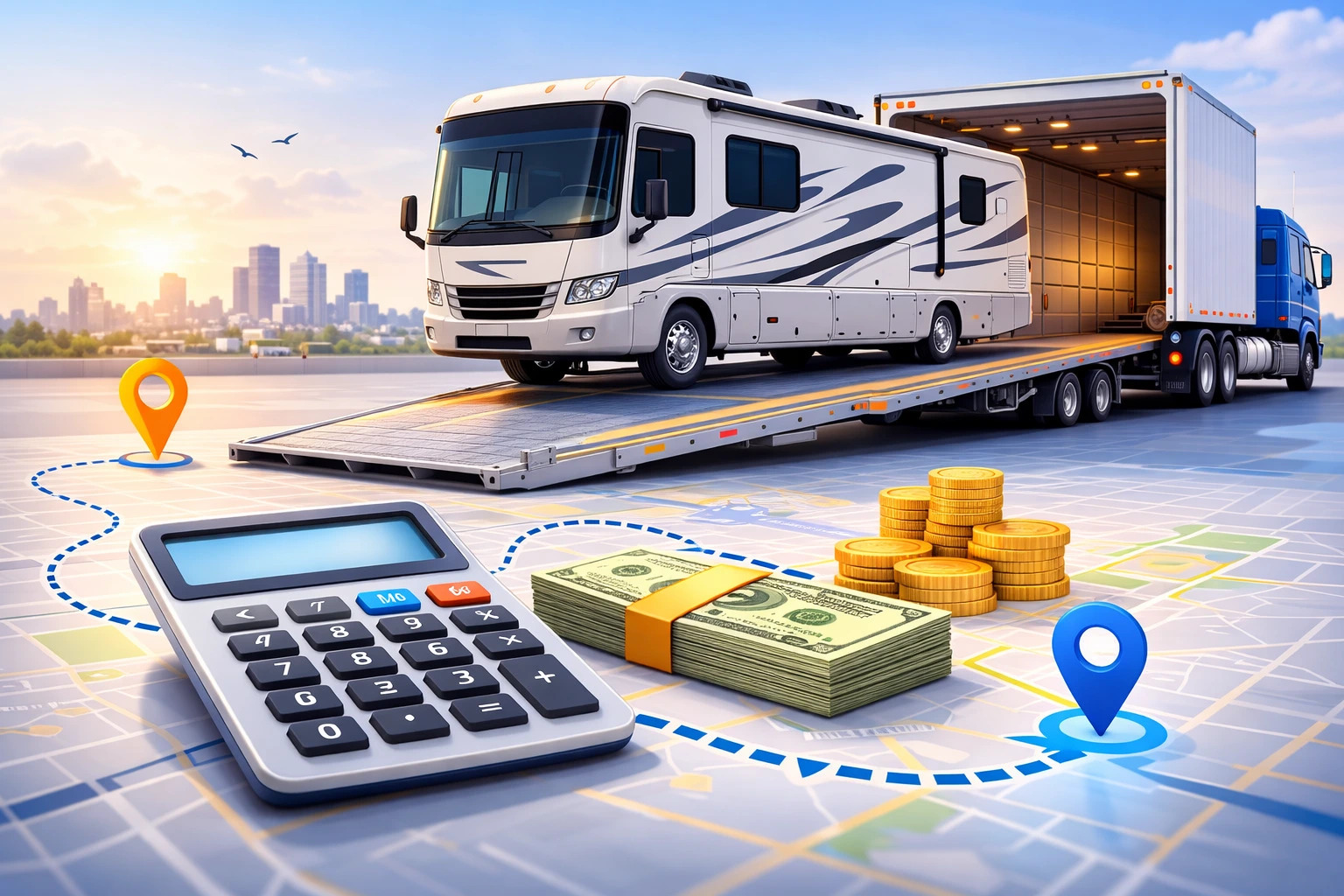 Use an RV shipping cost calculator to estimate pricing based on distance, RV size, and transport type.
